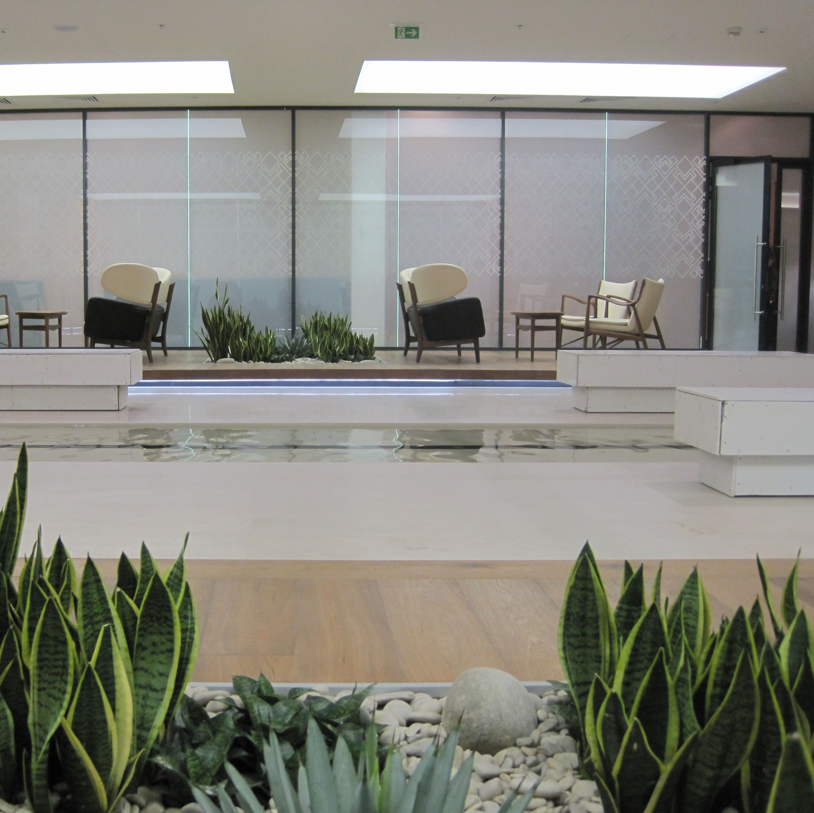 В дизайне комплекса большую роль играют оформление фасадов натуральным камнем и интересная архитектура атриумов в общих зонах делового центра. Так, благодаря их наличию, здание наполняется естественным светом. Окна в офисных помещениях качественно тонированы, благодаря чему сотрудники могут комфортно работать в любую погоду.